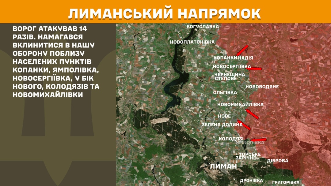 На Лиманському напрямку ворог атакував 14 разів, намагався вклинитися в українську оборону поблизу населених пунктів Копанки, Ямполівка, Новосергіївка, у бік Нового, Колодязів та Новомихайлівки.
