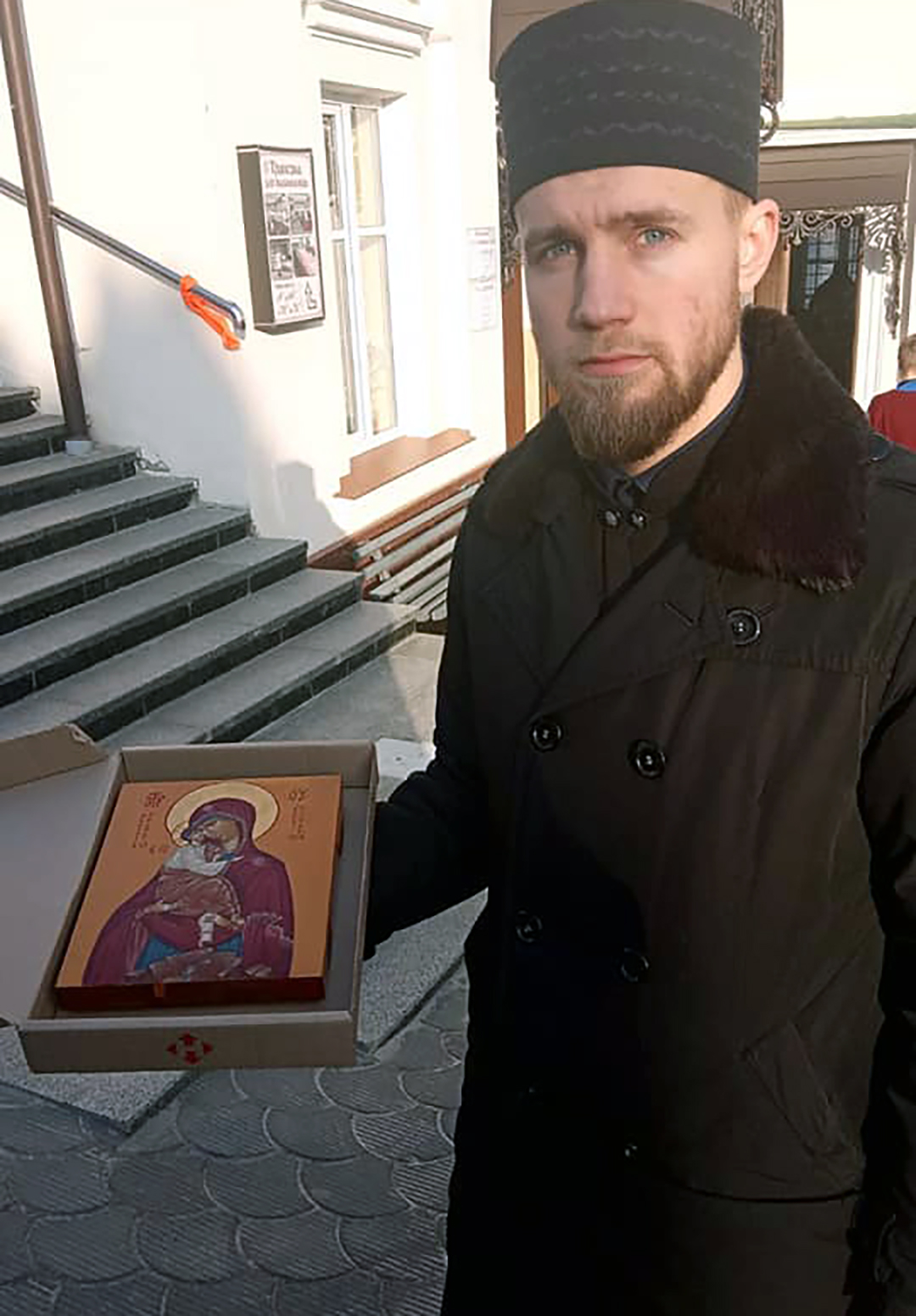 Він служить помічником капелана, а його іконописні роботи можна побачити в українських храмах та в закордонних приватних колекціях