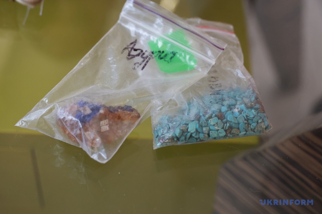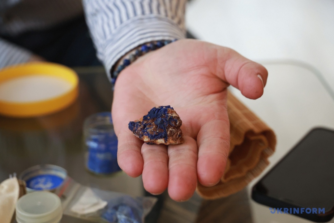 – Ціни дуже різні. У цьому пакетику десь 35 грамів – я взяв за 400 грн. Цей шматочок, тут небагато лазуриту, я взяв за 600 грн. Писати на синтетичних пігментах дешевше, але це інше кольорове звучання, – каже він.