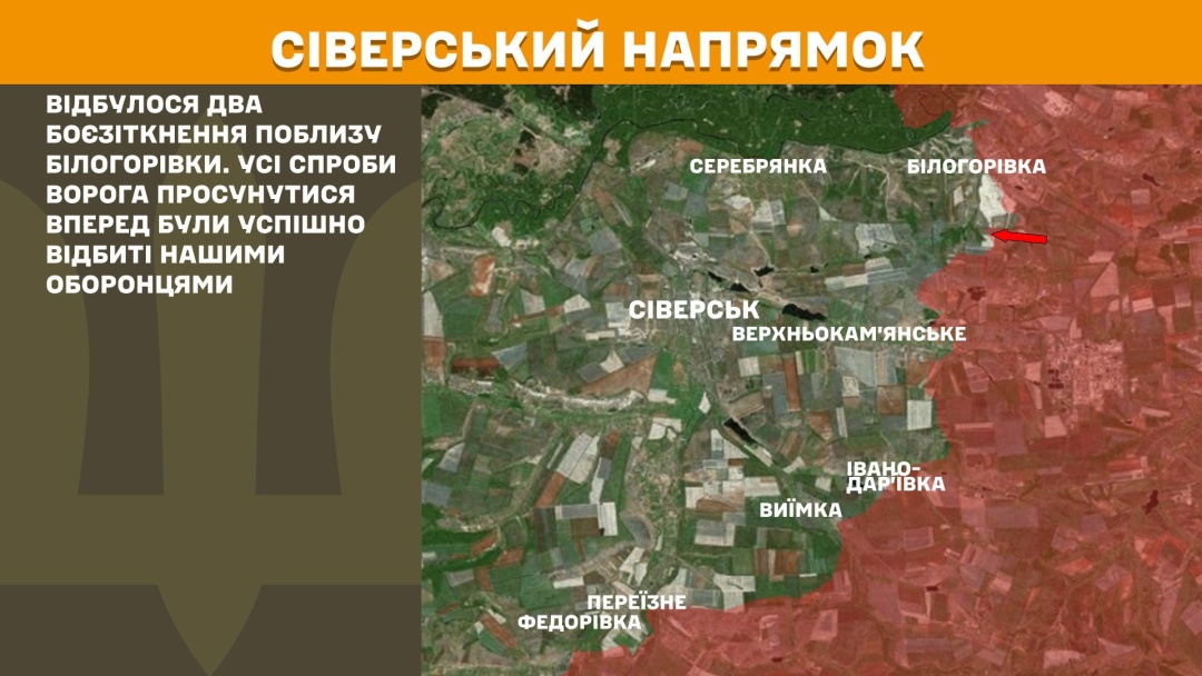 На Сіверському напрямку сталися два боєзіткнення поблизу Білогорівки. Усі спроби ворога просунутися вперед були успішно відбиті.