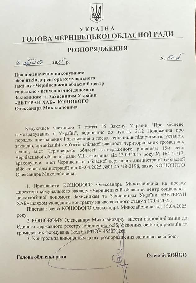 Розпорядження про призначення Олександра Кошового керівником «Ветеран Хабу» / Олексій Бойко. Facebook