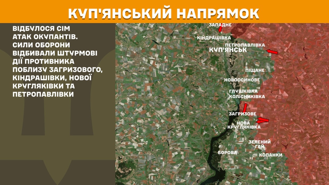 На Куп’янському напрямку вчора відбулося сім атак окупантів. Сили оборони відбивали штурмові дії противника поблизу Загризового, Кіндрашівки, Нової Кругляківки та Петропавлівки.