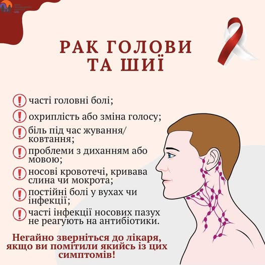 Загальні симптоми: часті головні болі; охриплість або зміна голосу; біль при жуванні/ковтанні; біль у верхніх зубах; біль у шиї, що не проходить; проблеми з диханням чи мовою; постійні болі у вухах чи інфекції; носові кровотечі, кривава слина чи мокрота; незагоєна виразка в роті або на язиці; часті інфекції носових пазух не реагують на антибіотики; біла або червона пляма на яснах, язиці або в роті; набряк щелепи, шиї або бічної частини обличчя.