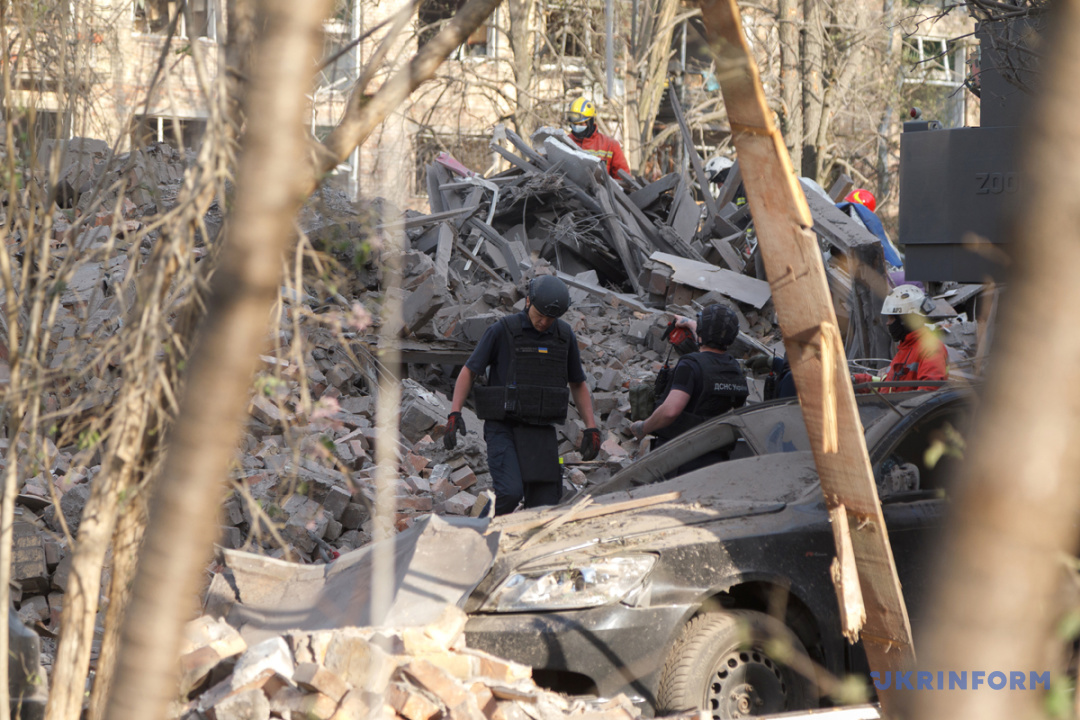 Фотокореспондент Укрінформу побував у Святошинському районі столиці, де рятувальники розбирають завали у двох багатоповерхових житлових будинках.