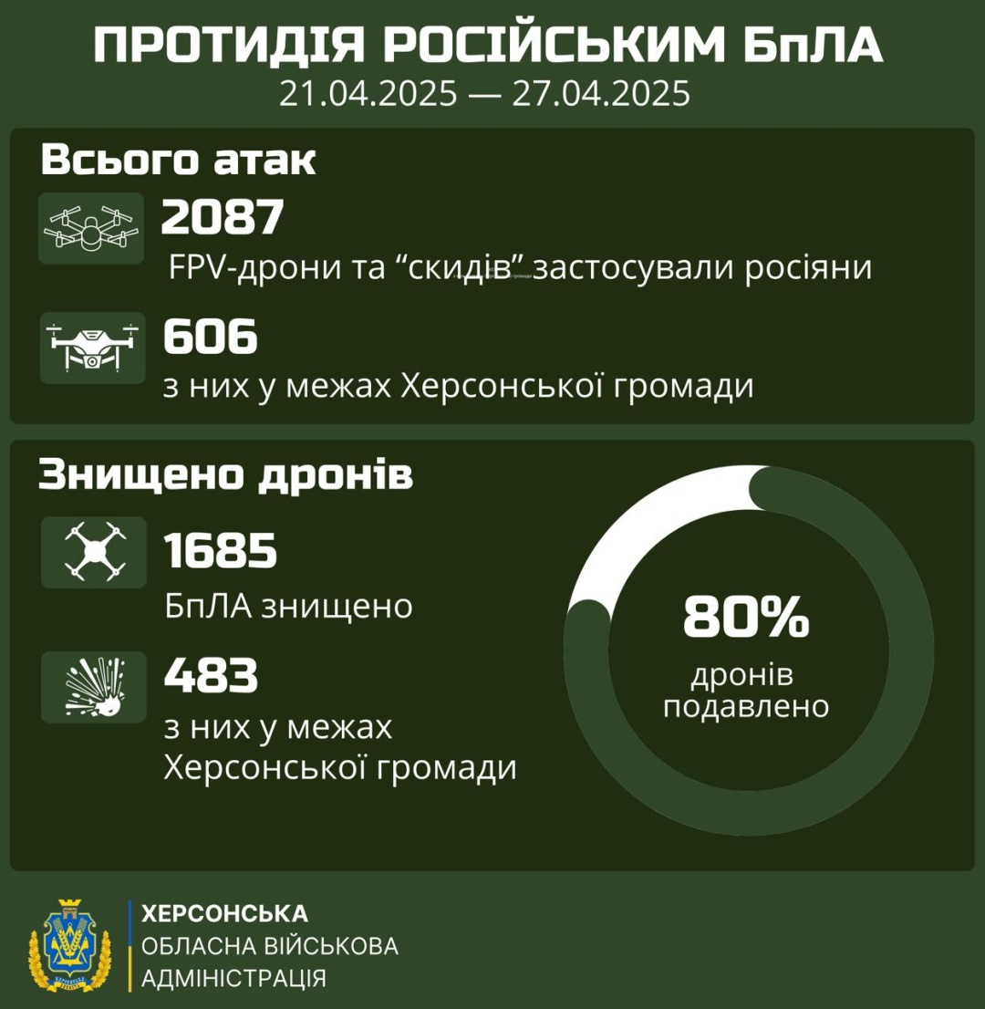 Херсонська ОВА уточнює, що таким чином придушено близько 80% БпЛА.