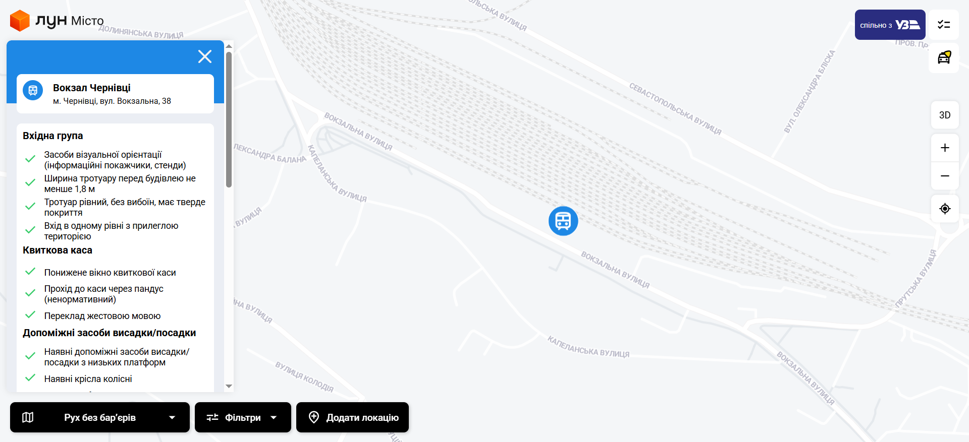 Залізничний вокзал Чернівців увійшов до переліку безбар’єрних. Інтерактивну мапу з 53 вокзалами по всій Україні створило акціонерне товариство «Українська залізниця» спільно з ЛУН Місто.