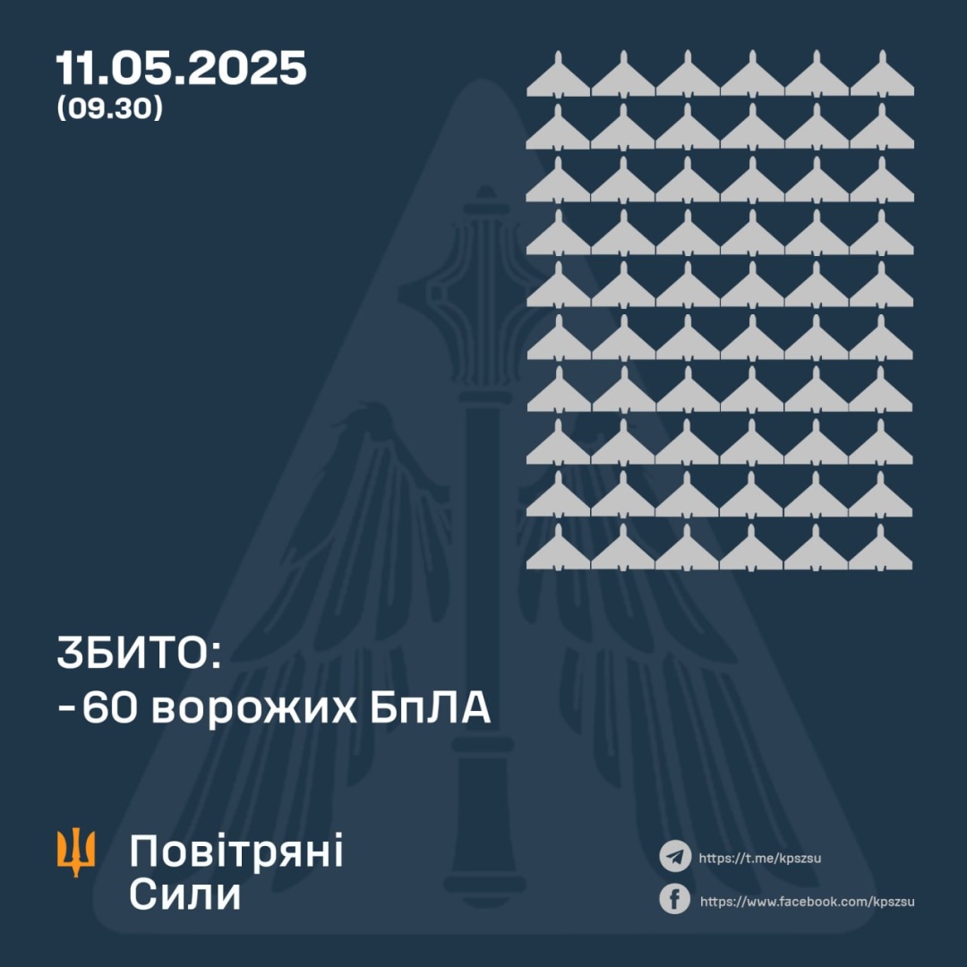 Станом на 09:30 неділі підтверджене збиття 60 російських дронів типу Shahed (безпілотників інших типів) на сході, півночі, півдні та в центрі країни.