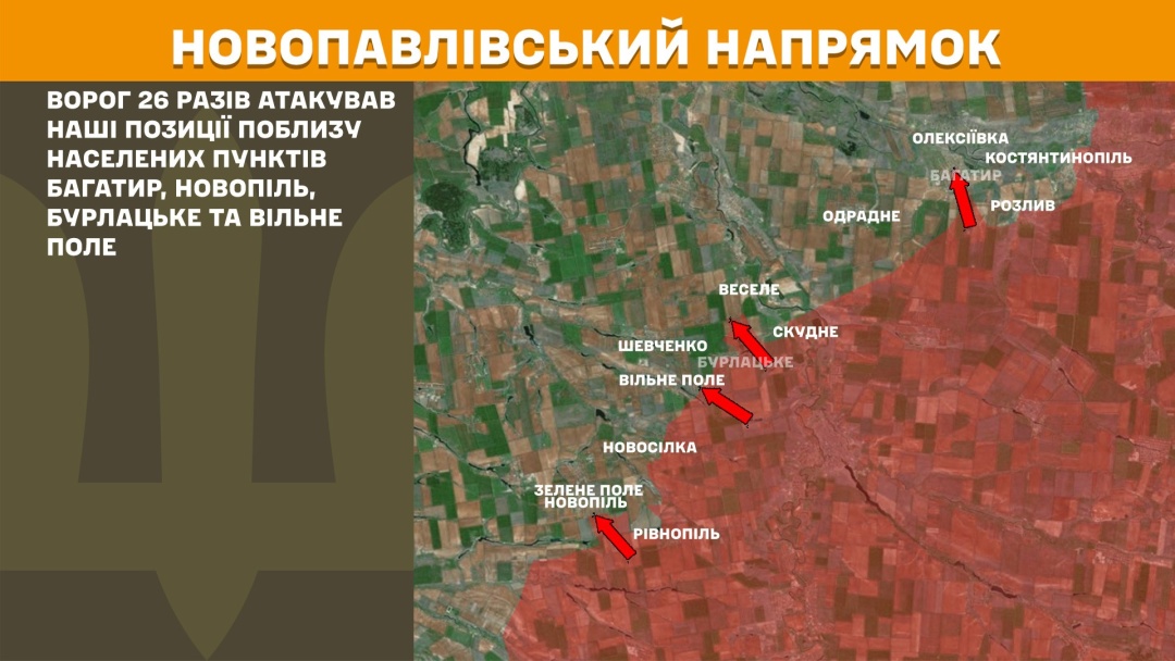 На Новопавлівському напрямку російські війська 26 разів атакували позиції Сил оборони поблизу Багатиря, Новополя, Бурлацького та Вільного Поля.