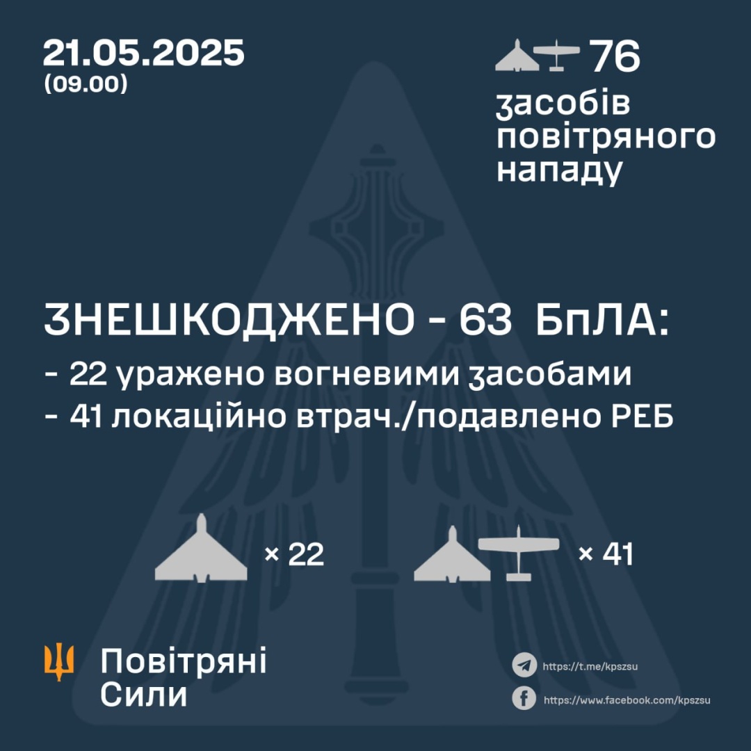 Із 00:30 середи, 21 травня, росіяни атакували Україну 76 ударними БПЛА типу Shahed і безпілотниками-імітаторами різних типів із напрямків: Курськ, Орел, Брянськ.