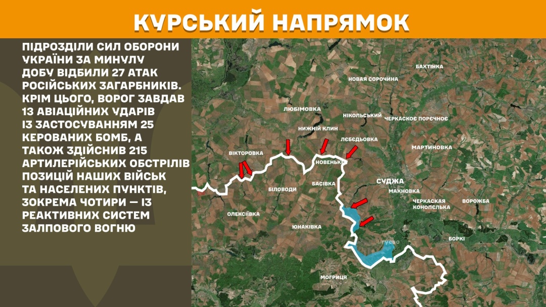 На Курському напрямку підрозділи Сил оборони України за минулу добу відбили 27 атак російських загарбників. Крім цього, ворог завдав 13 авіаційних ударів із застосуванням 25 керованих бомб, а також здійснив 215 артилерійських обстрілів позицій наших військ та населених пунктів, зокрема чотири – із реактивних систем залпового вогню.