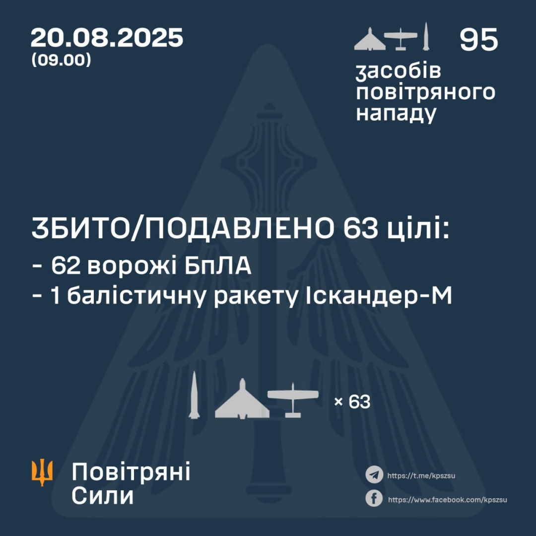За попередніми даними, станом на 09:00 середи, 20 серпня, ППО збила/подавила один "Іскандер-М" та 62 безпілотники різних типів на півночі та сході України.