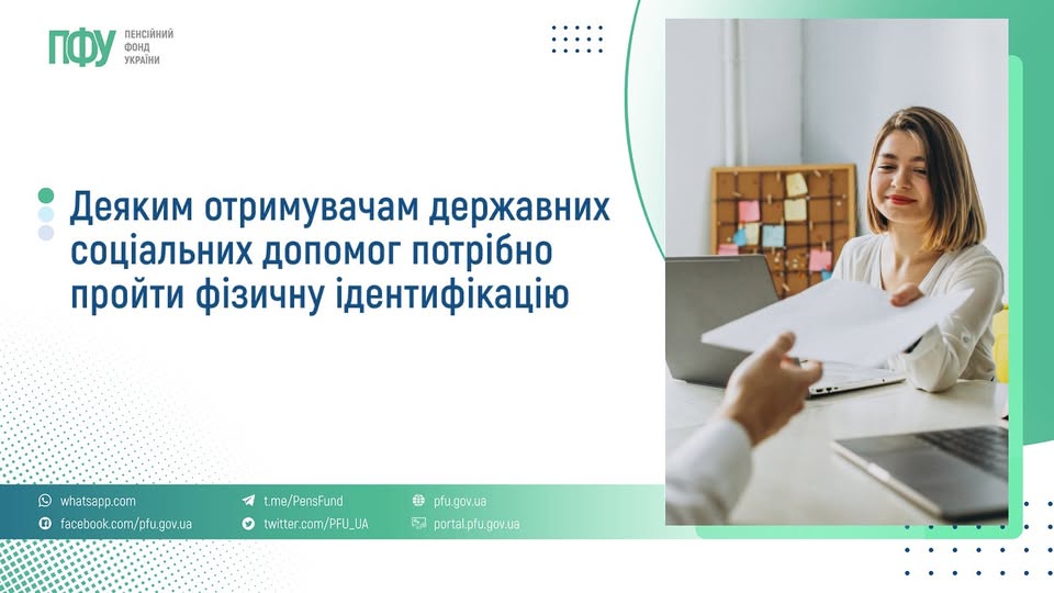 Зокрема, пройти фізичну ідентифікацію потрібно одержувачам державної соціальної допомоги: особам, які не мають права на пенсію, та особам з інвалідністю, державної соціальної допомоги на догляд, державної соціальної допомоги особам з інвалідністю з дитинства та дітям з інвалідністю.