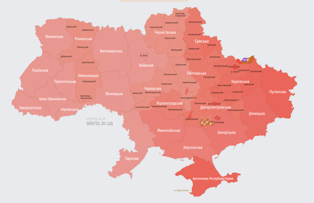 Актуальна мапа повітряних тривог станом на 02:28 / Джерело: https://alerts.in.ua/