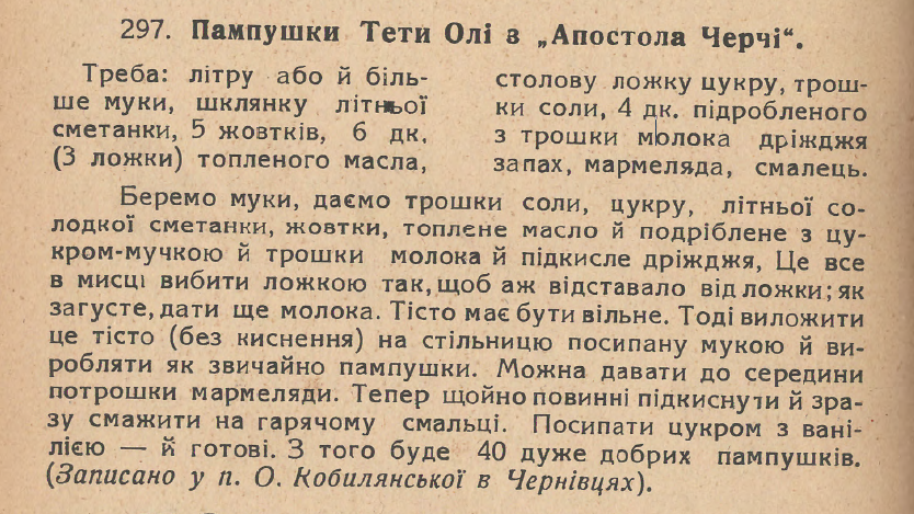 «Вона розуміла свій обов’язок – наготувати й нагодувати родину. Адже спершу мешкала з батьками, потім з названою донькою та її дітьми. Принцип ведення господарства у Кобилянської – ощадливість. Їжа має бути доступною та смачною. Готувала багато різного, надто якщо це стосувалося десертів: пляцочки, завиванці, торти, печиво», – каже Юлія Микосянчик.