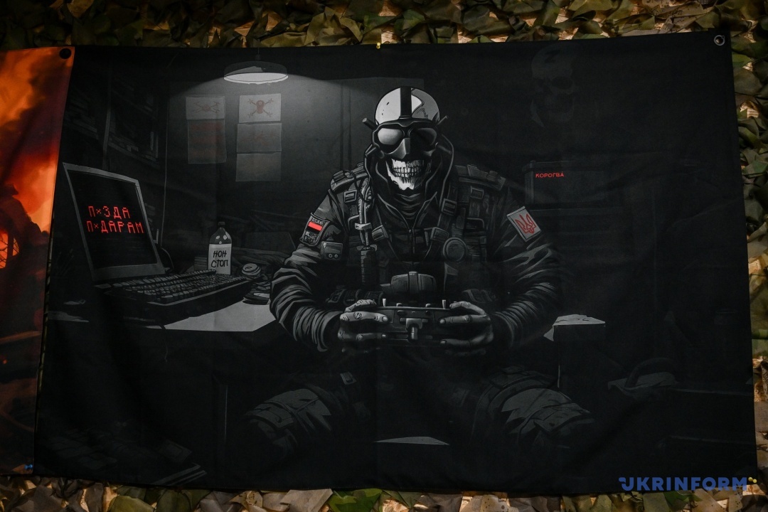 Над його умовним робочим місцем є поличка, на ній ковбойський капелюх – його талісман. Колись командир із позивним «Шериф» запропонував Романові: «Я Шериф, а ти будеш Ковбоєм», – та й так і повелося. На стінах – яскраві сучасні хоругви. Каже: вони надихають.