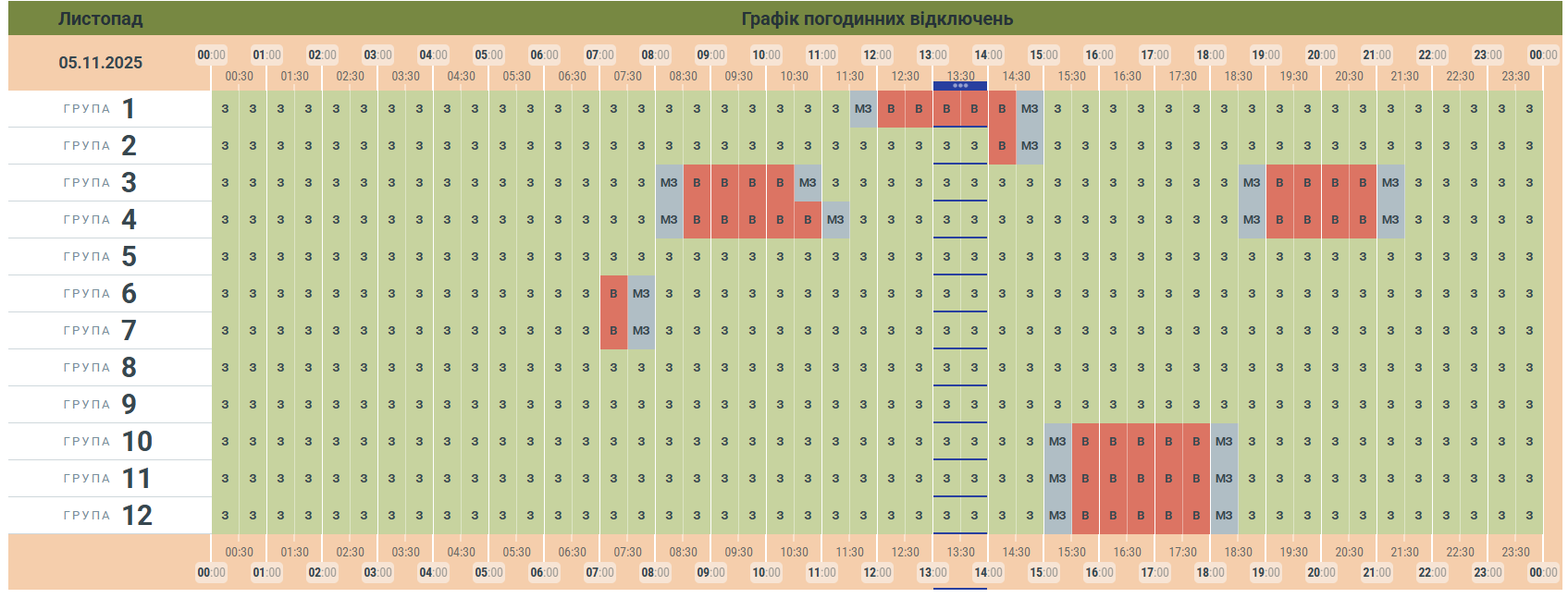 Клітинки сірого кольору в графіку – це той час, коли кожна група може бути заживлена, залежно від змін у лімітах споживання або зменшенню споживанню електроенергії. Також години сірої зони використовують як запасний час для перемикання між групами, щоб виконати необхідні технічні та безпекові дії.