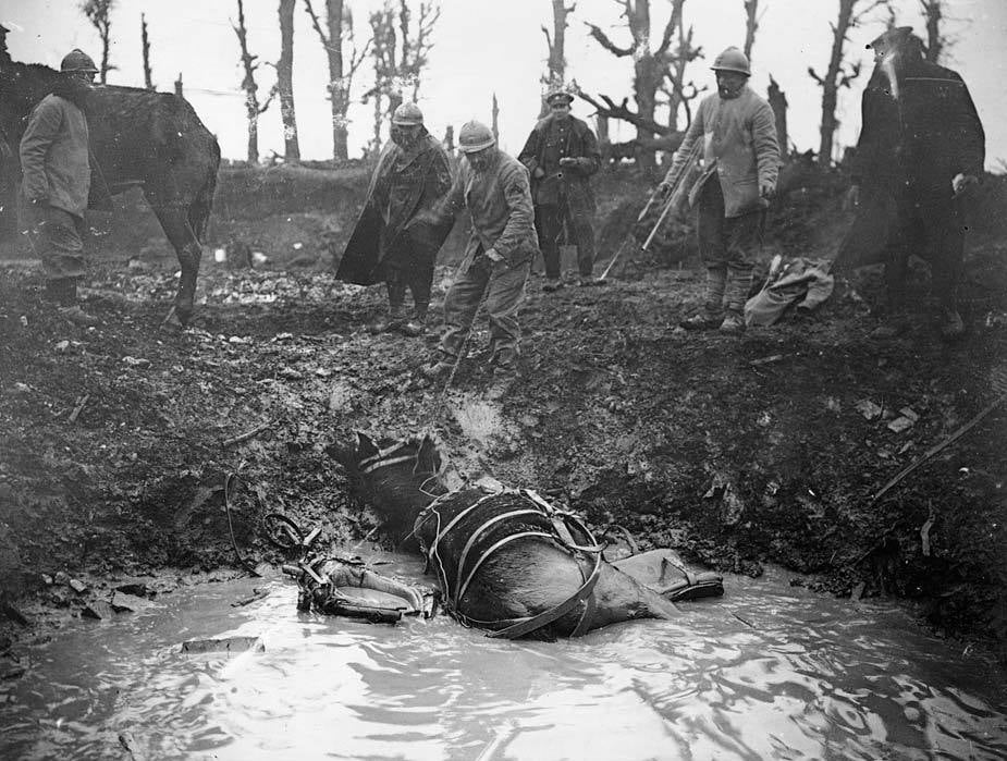 Мул лежить у вирві від снаряду на Західному фронті. Французькі солдати намагаються його витягти. Фото: wikipedia