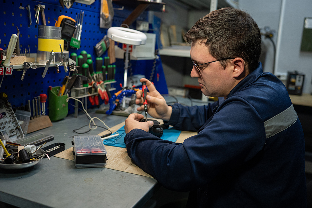 Тепер Анастасія та Сергій разом працюють у цеху з ремонту оптичних приладів. Такий цех створили з початком великої війни, адже оптика – це очі піхоти. Щомісяця ремонту потребують десятки оптичних приладів: біноклі, приціли, прилади нічного бачення тощо. Сергія вдалося застати за ремонтом монокуляра нічного бачення. Чоловік розповідає, що робота не складна, але потребує скрупульозності: “Зараз до нас надходить чимало зарубіжних приладів і треба все вивчати, розбиратися у кожній деталі й далі вже лагодити”.