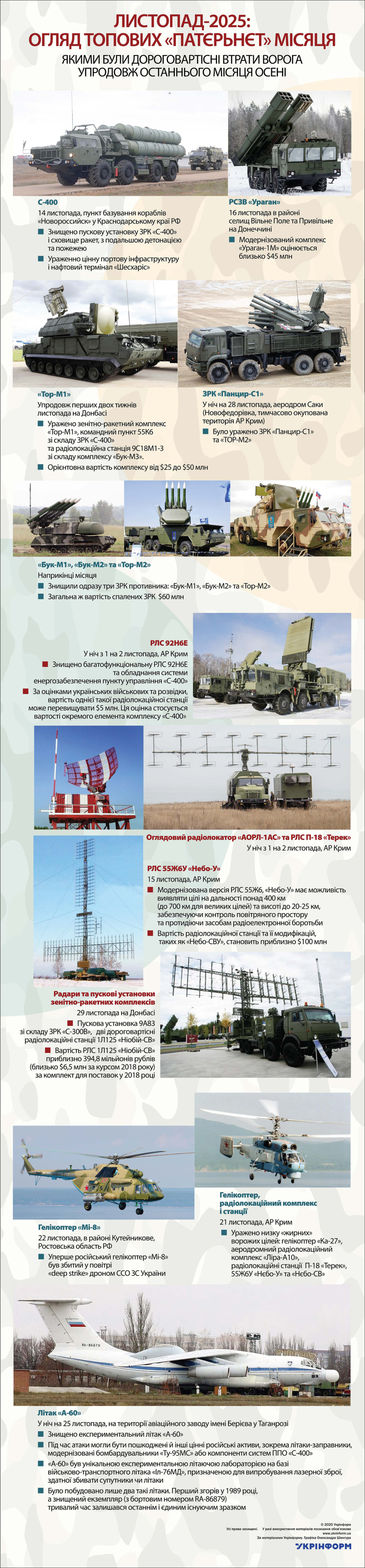 У листопаді захисники України продовжували викошувати «жирні цілі» росармії. Під ударами Сил оборони палали рідкісні радіолокаційні станції, на друзки розліталися командні пункти й пускові установки зенітних ракетних комплексів, в утиль відправлялися унікальні експериментальні літаки та інший болотний мотлох.