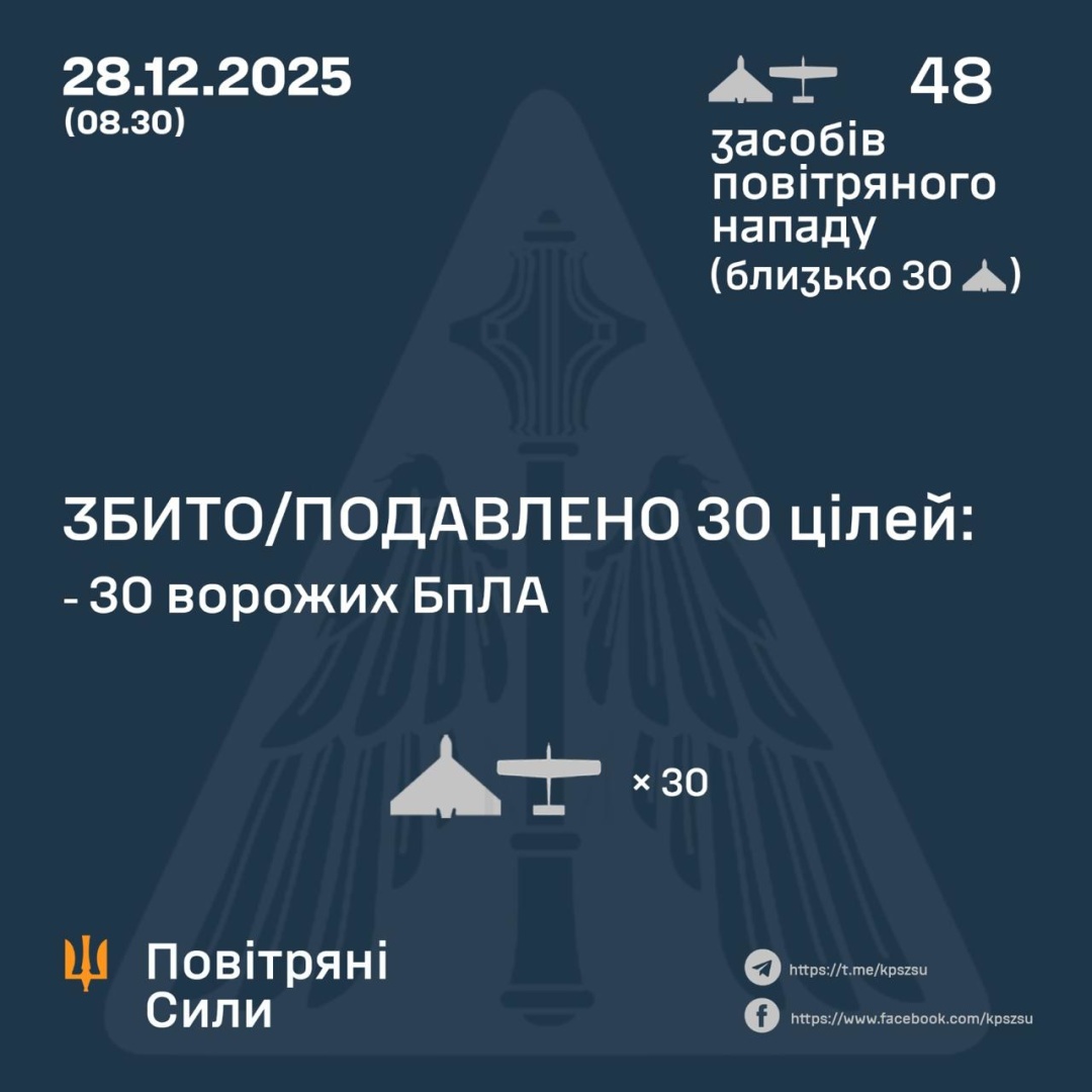 За попередніми даними, станом на 08:30, неділі, 28 грудня, ППО збила / подавила 30 дронів на півночі, півдні та сході України.