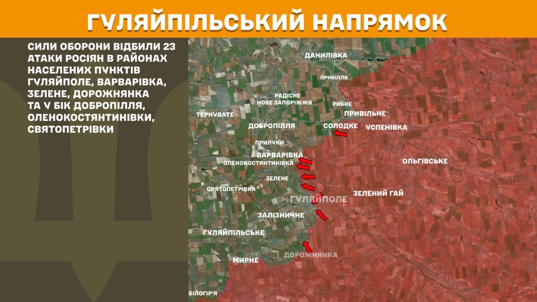 На Гуляйпільському напрямку Сили оборони відбили 23 атаки росіян в районах населених пунктів Гуляйполе, Варварівка, Зелене, Дорожнянка та у бік Добропілля, Оленокостянтинівки, Святопетрівки.