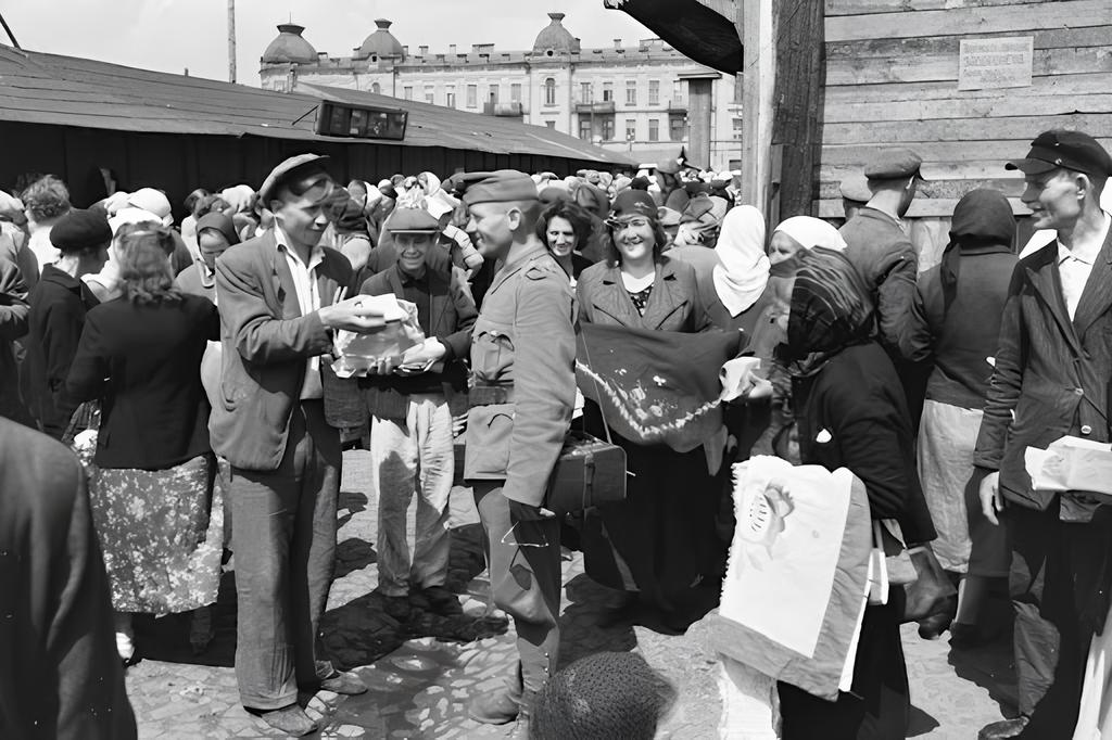 Знаменита фотографія Євбазу часів німецької окупації, коли люди обмінювали речі на продукти. Фото: histomil.com