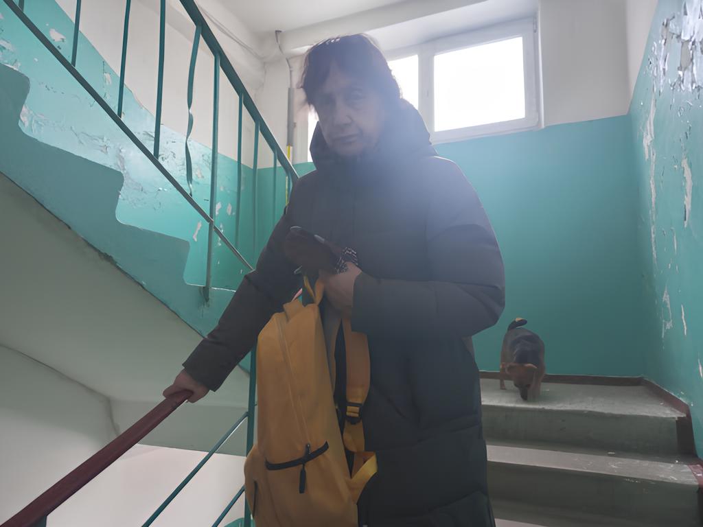 Надія Качалка спускається сходами із своїм песиком. Фото з сімейного архіву Надії Качалки.
