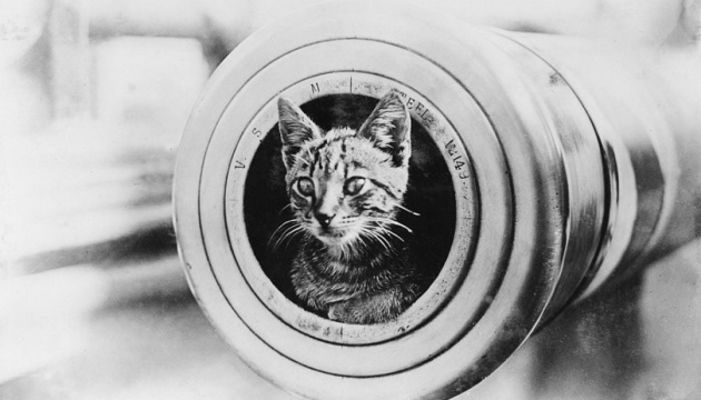 Перше фото: Корабельний кіт визирає з жерла 6-дюймової гармати на борту австралійського легкого крейсера HMAS Encounter. Перша світова. Фото iwm.org.uk