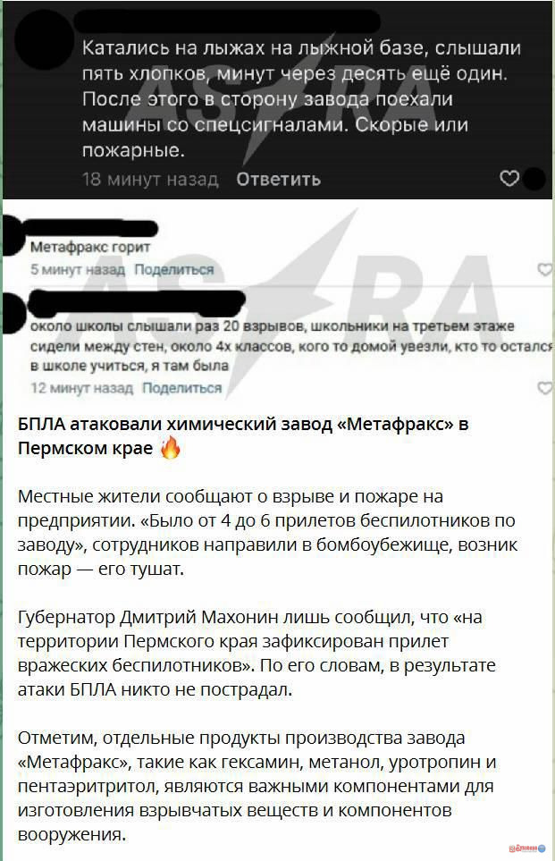Як повідомляв Укрінформ, безпілотники атакували у вівторок, 17 лютого, хімічний завод «Метафракс Кемікалс» у Пермському краї Росії.