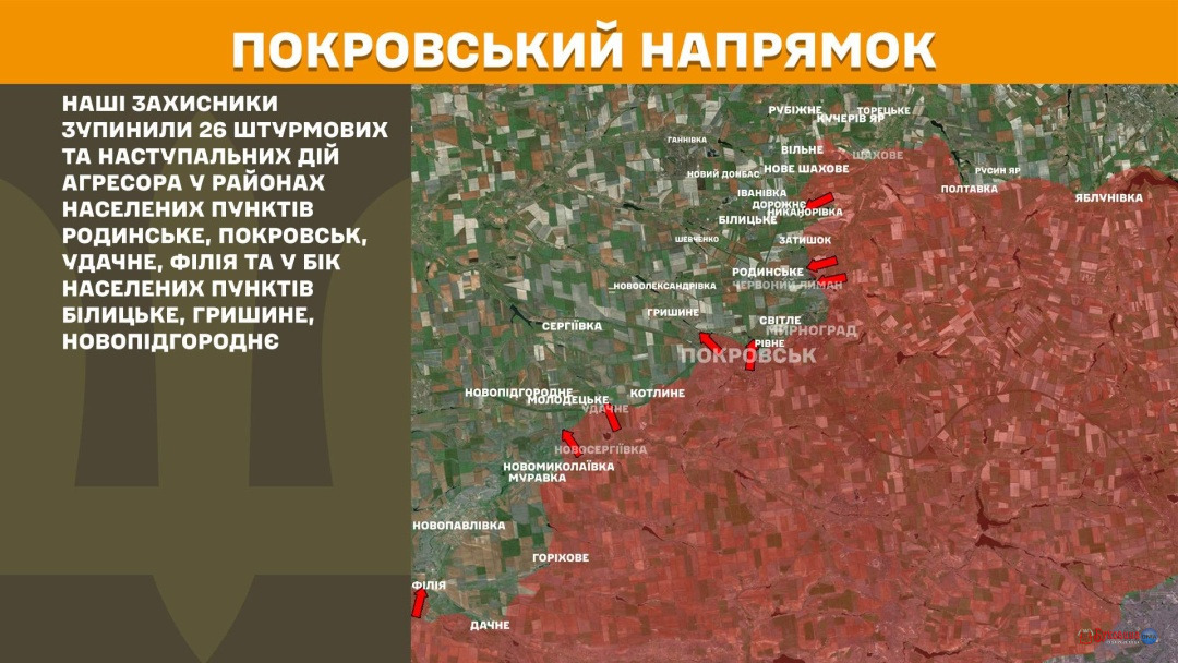 На Покровському напрямку захисники України зупинили 26 штурмових і наступальних дій армії РФ у районах Родинського, Покровська, Удачного, Філії та в бік Білицького, Гришиного і Новопідгороднього.