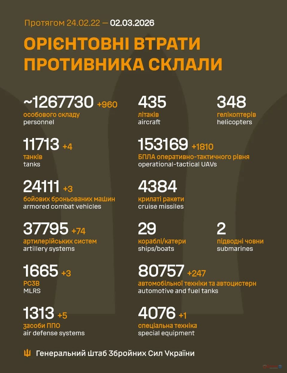 Загальні бойові втрати російських військ з 24 лютого 2022 року по 2 березня 2026 року на війні проти України становлять близько 1 267 730 осіб, зокрема 960 осіб – за попередню добу.