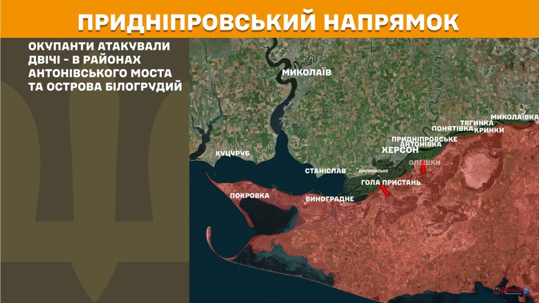 На Придніпровському напрямку загарбники атакували двічі – у районах Антонівського моста та острова Білогрудий.