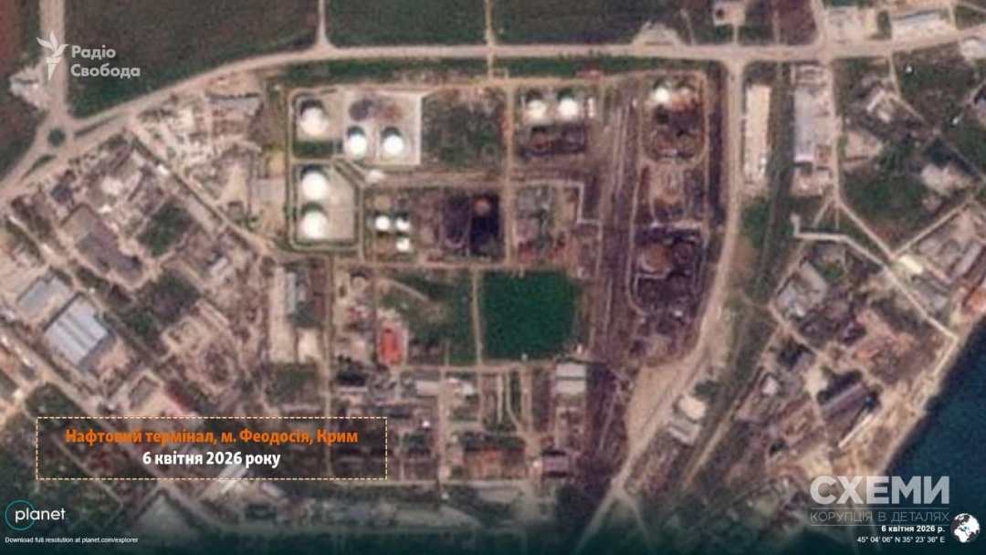 На знімках компанії Planet Labs за 8 квітня, які є у розпорядженні журналістів "Схем" (Радіо Свобода), видно пожежу та клуби диму на території ключової нафтобази окупованого Росією Криму – "Морський нафтовий термінал" у Феодосії.