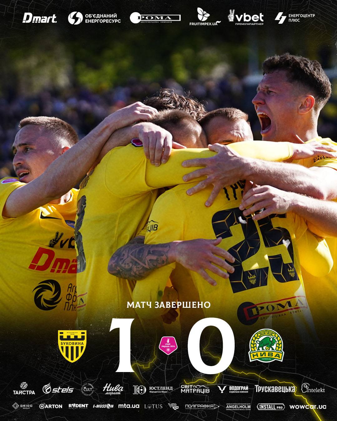 Футбольний клуб «Буковина» у домашньому матчі 25 туру VBET Першої ліги здолав тернопільську «Ниву» з рахунком 1:0.