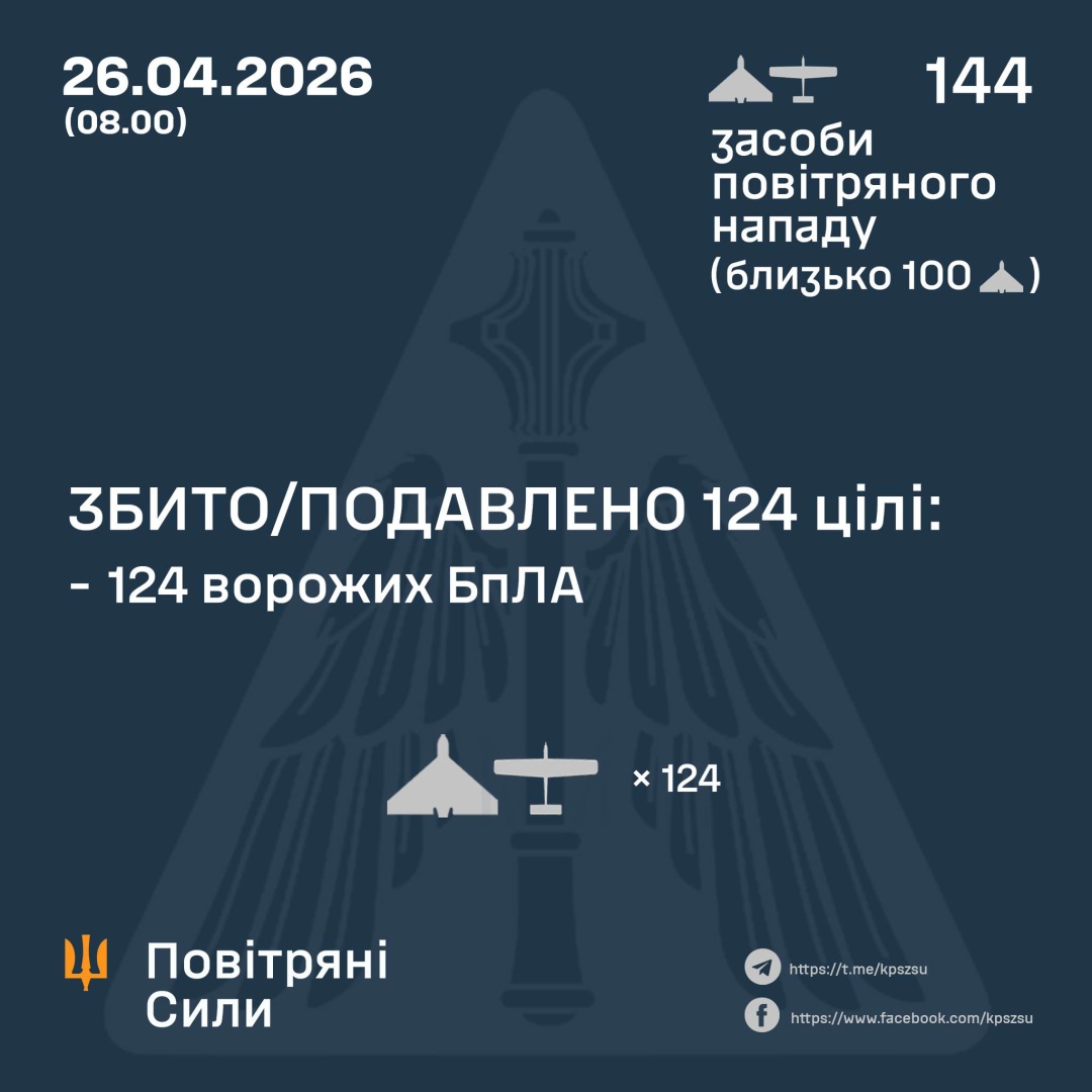 Сили протиповітряної оборони з вечора 25 квітня знешкодили 124 російські безпілотники зі 144 запущених.