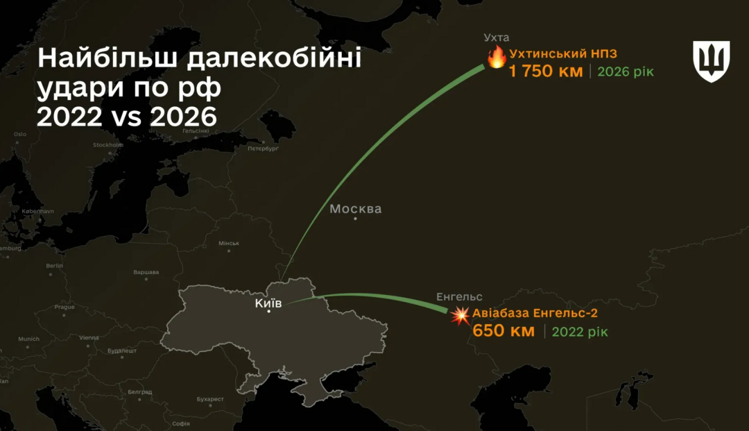 У лютому 2026 року підрозділи Служби безпеки України та інших складових Сил оборони уразили Ухтинський нафтопереробний завод у Республіці Комі. Це підприємство розташоване на відстані приблизно 1 750 км від державного кордону.